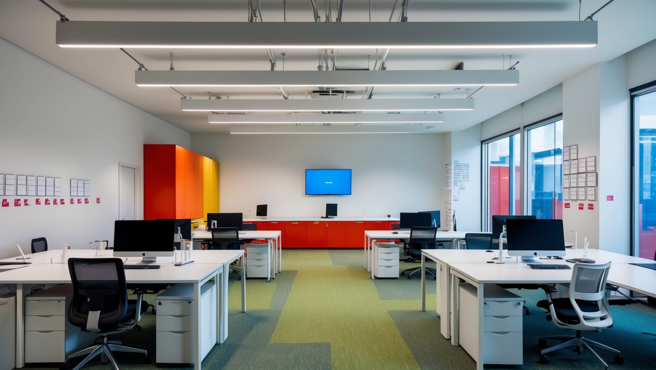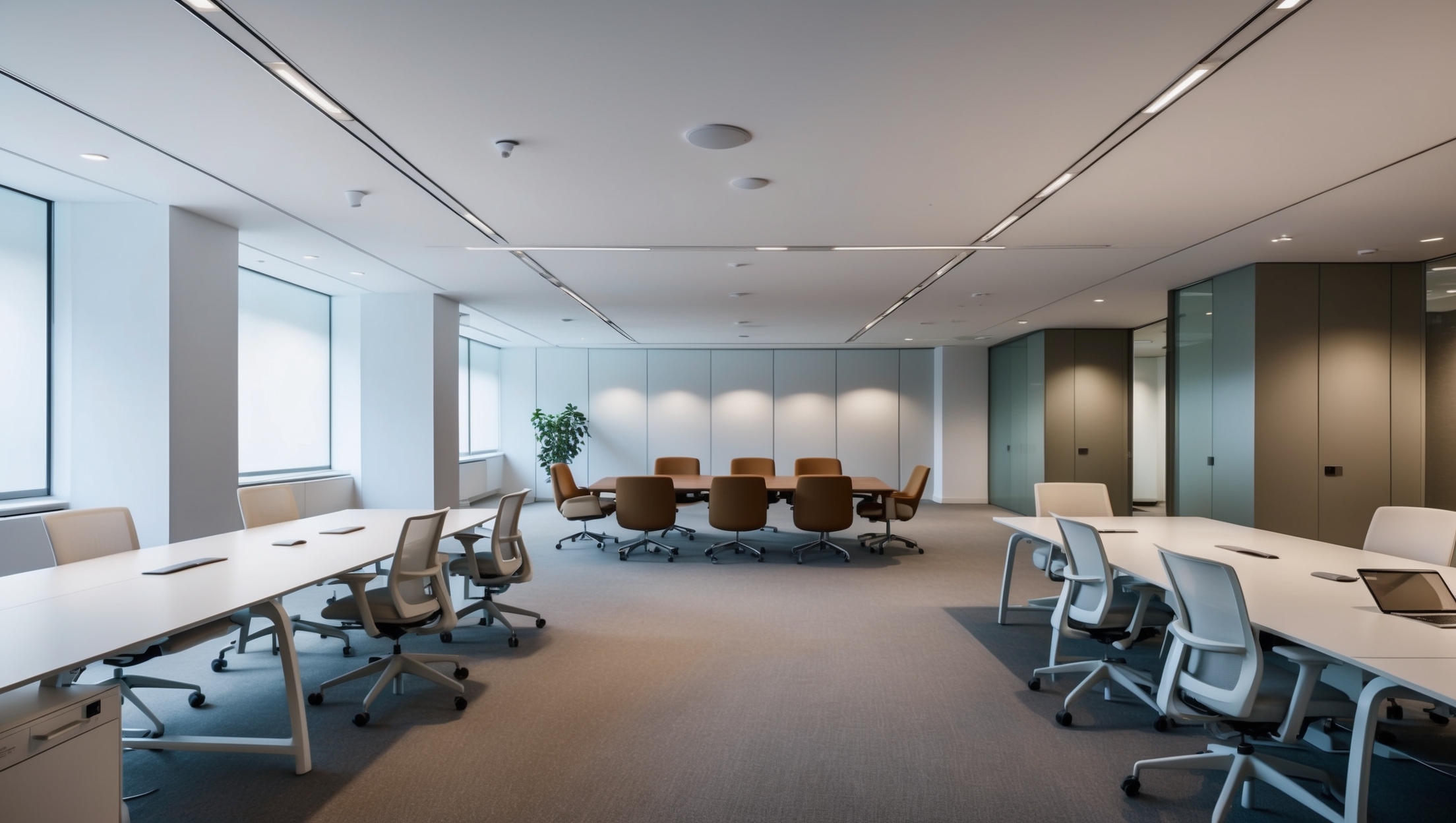 Entscheidende Faktoren sind eine leistungsfähige und flexible IT-Infrastruktur, eine ausreichende und intelligent platzierte Stromversorgung sowie die Integration moderner Medientechnik. Diese Elemente müssen eine nahtlose Konnektivität für hybride Arbeitsmodelle ermöglichen und an zukünftige technologische Entwicklungen anpassbar sein.